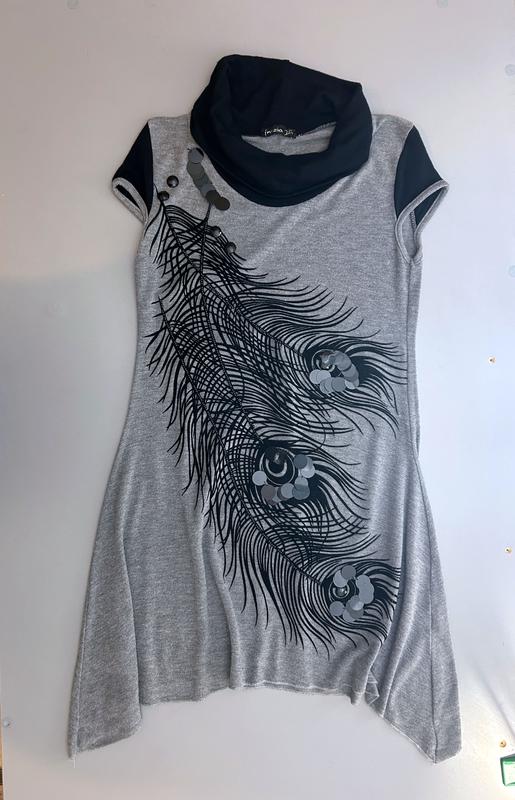 Нарядная трикотажная туника с бархатистым декором и пайетками.. Горло закрыто большим мягким хомутом. Этикетка с размером и составом ткани отсутствует. Заміри на фото.