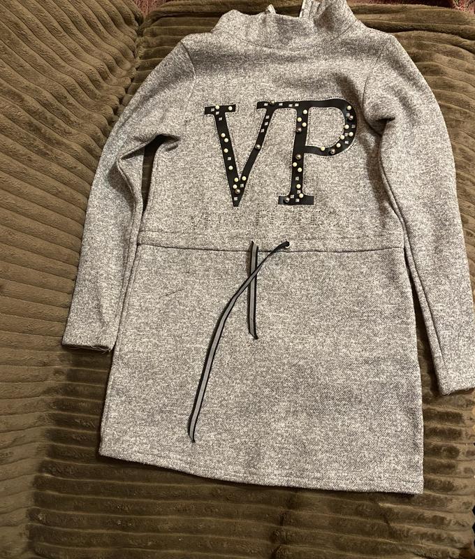 Тепла сукня-туніка для дівчинки, розмір 4 (орієнтовно 122–128 см). Колір сірий меланж, м’яка та приємна до тіла. Спереду стильний принт “VP” зі стразами. Є зручна блискавка зверху та пояс-утяжка на талії — можна регулювати посадку 💛 Якщо потрібні додаткові фото або заміри — пишіть, відповідаю швидко ❤️