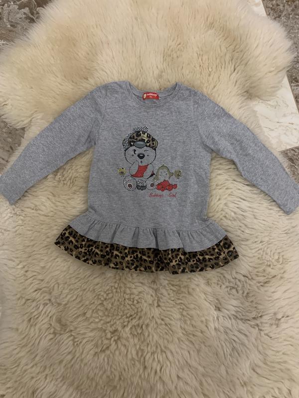 Удлиненная кофта-туника с рюшкой-воланом для девочки на рост 110 см(можно и больше рост).Цвет серый с большой красивой апликацией.Состав 100%котон.Рукавчик длинный.Пятен и катышек нет.Состояние идеальное,очень приличная и нарядная,из дорогой серииBobbogi. Длина изделия-47см,длина рукава-38см,плечи-24,5см,под руками-30,5см,в бедрах-33см