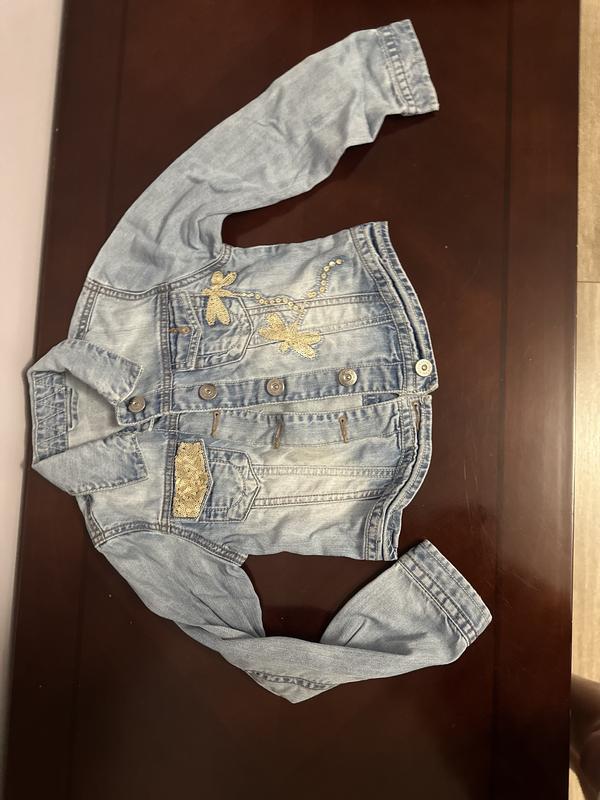 джинсовая куртка Next, очень красивая,стан красивая.Размер 5-6 лет, переносили дольше, большемерит. Фотографировала вечером,цвет более насыщенный. Есть очень хорошая аппликация из пайеток.Рукав 44, длина 37, пог 32