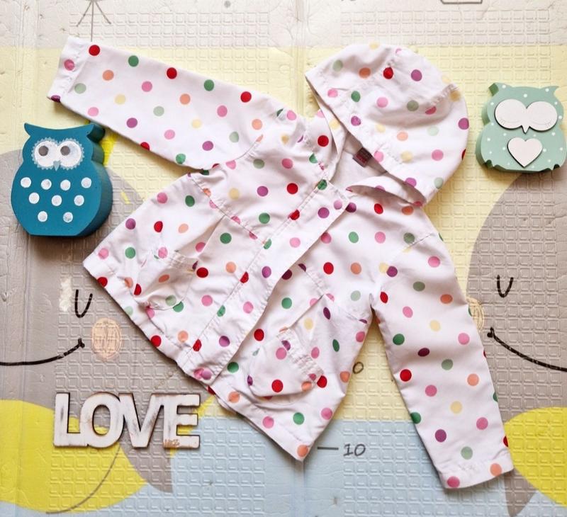 Очень милая белочка в разноцветных горошек ветровочка на маленькую девочку от бренда TU. На 1,5-2 года. Рост - 86-92 см. Замеры: - длина рукава - 33 - ширина - 34 - длина - 38