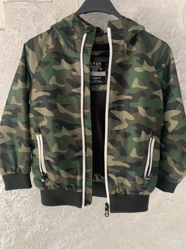 Стильна вітровка на застібці для хлопчика розмір 104-110 на 4-5 років. Всередині курточки трикотажна підкладка, внизу та на рукавах манжети на резинці. На рукаві є зображення. Є дві бічні кишені на застібках. Капюшон не відстібається. Довжина куртки 43 см, рукав від плеча 39 см.
