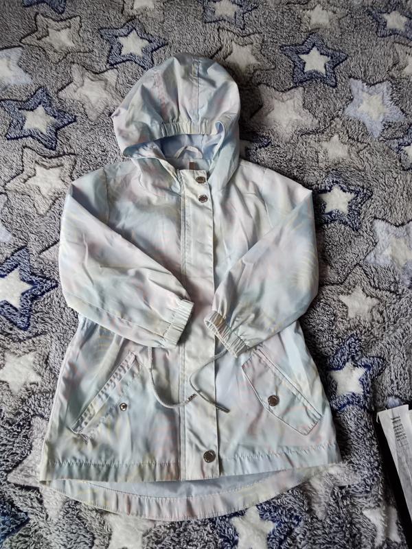 красивая ветровка для девочки нежно голубого цвета. сзади удлиненная.по наборке указано рост 110. замеры длина 49/55см, рукав 36 см, плечи 29 см.