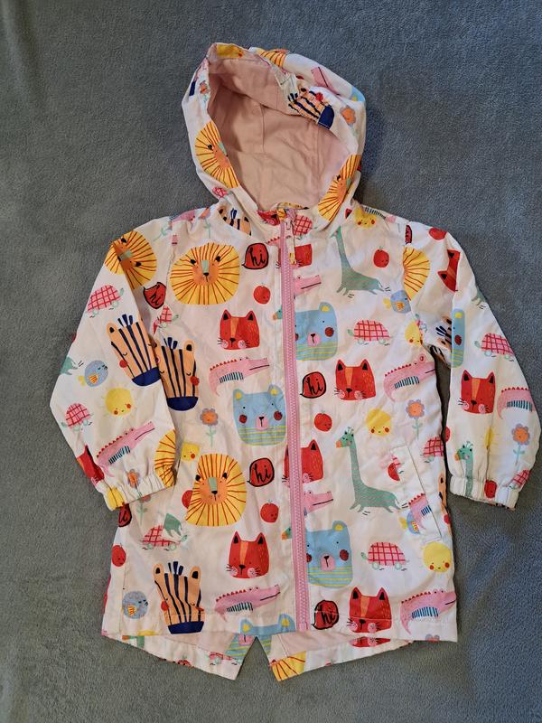 Ветровка на девочку 3-4роки, состояние идеально. На хлопковой подкладке, легкая на теплую погоду. Имеет 2 кармана Замеры: Длина впереди 48 см Длина сзади 52 см Рукав 35 см Ног 34 см