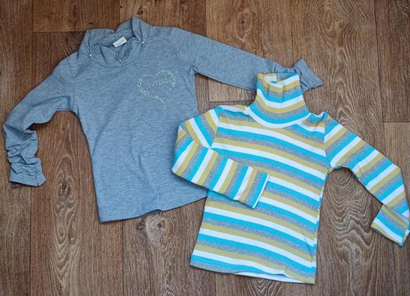 Продаж тільки набором, ціна вказана за обидва. Сірий — трикотажний гольф ТМ Beneti girls р.104 см, 92% бавовна та 8% еластан, стан добрий, бракує страз і є невелика дірочка на рукаві (де призбирано), всередині на байці, виробництво Туреччина. Довжина від плеча 39 см, ширина під ручками 27,5 см, плечі 26 см, рукав від плеча 35,5 см. Смугастий — гольф у рубчик, всередині утеплений, стан дуже гарний. Довжина від плеча 39 см, ширина під ручками 29 см, плечі 29 см, рукав від плеча 36,5 см.