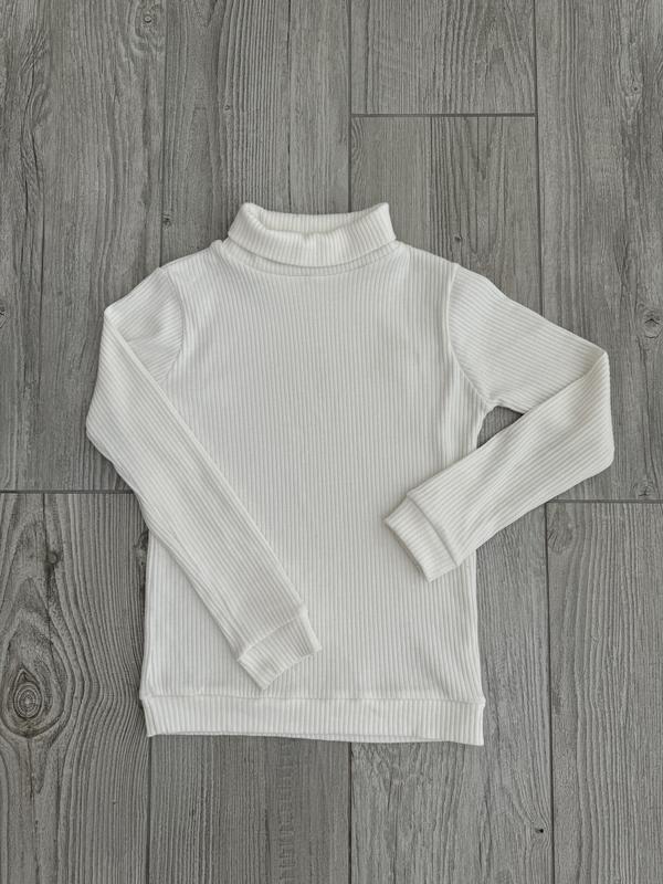 Гольфик на дівчинку. Тканина дуже приємна до тіла, мʼяка, трикотаж - рубчик. На рукавах і низом іде манжет, не буде розтягуватися. Стан відмінний, без плям, жовтизни, катишок. Є лише один невеличкий нюанс (останнє фото): на одному манжеті дві зелені крапочки, виводити не пробувала, але я думаю , що вони легко плямовивідником відстіраються. Орієнтовно на ріст 134-146. Заміри надаю: довжина 49, рукав 47 см.