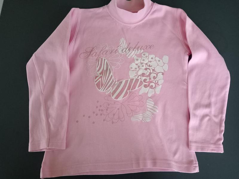 Хлопковый гольфик с цветочным рисунком Краска держится прочно, но трошечки потрескалась На 8-9 лет, рост 134 см Очень мягкий и качественный трикотаж, катышки не создаются Производство Турция Ширина по плечах 30 см Длина по спинке 46 см Длина рукава 42 см