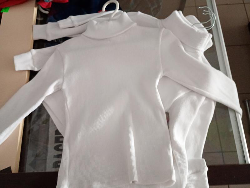 Гольфик білий у рубчик.Склад тканини-100% котон (на фото). Гольфик не тонкий, рукава длинные с манжеткой, воротник высокий отложной-10см. В ширину хорошо тянется ( но не обвисает). Есть три размера-92, 98. Пересылаю после оплаты на карточку. В наличии размеры 2/92 и 3/98.