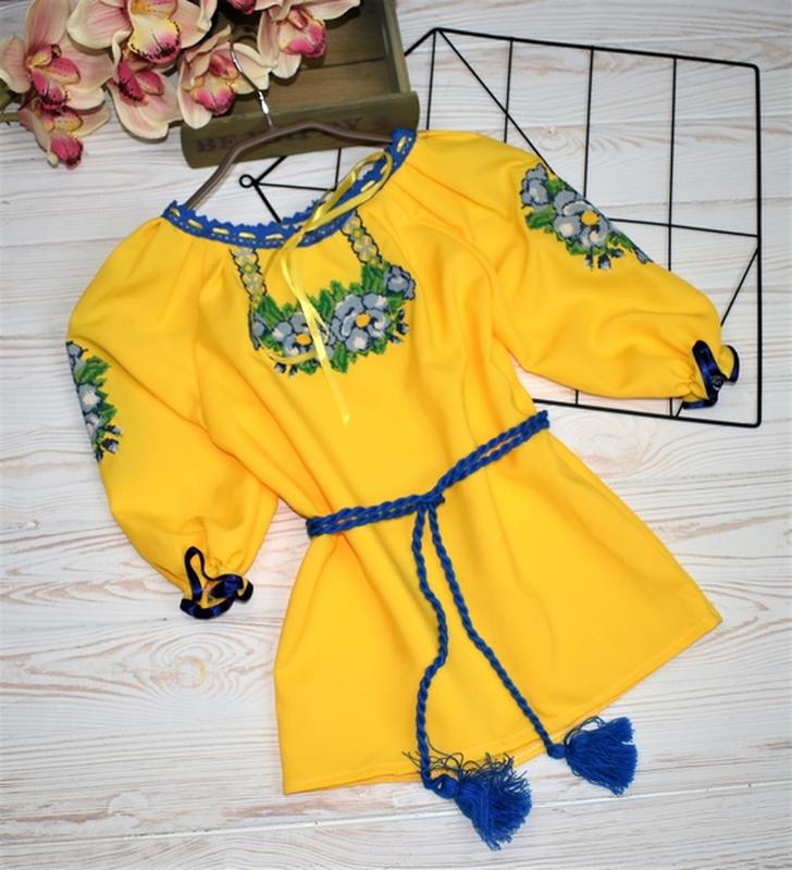 Вышиванка на девочку "Желто-голубое поле" Описание ✅Арт: 65518 ✅Выр-во: Украина ✅Тка-на: габардин ✅Дополнительно: вышивка машина, рукав 3/4, шнуровка у горловины регулируется. ✅Замеры: длина/ширина/рукав от горловины ✅Замеры подписаны верно! 116--48/37-33 122--52/39/35 128--54/43/36 134--56/45/37 140--57/46/38 146--59/47/36 152--61/48/37 ✅Возможна погрешность в измерениях +- 1/2 см 116 - 1шт 122 - 2шт 134 - 2шт 146 - 1шт Цена: 670 грн.