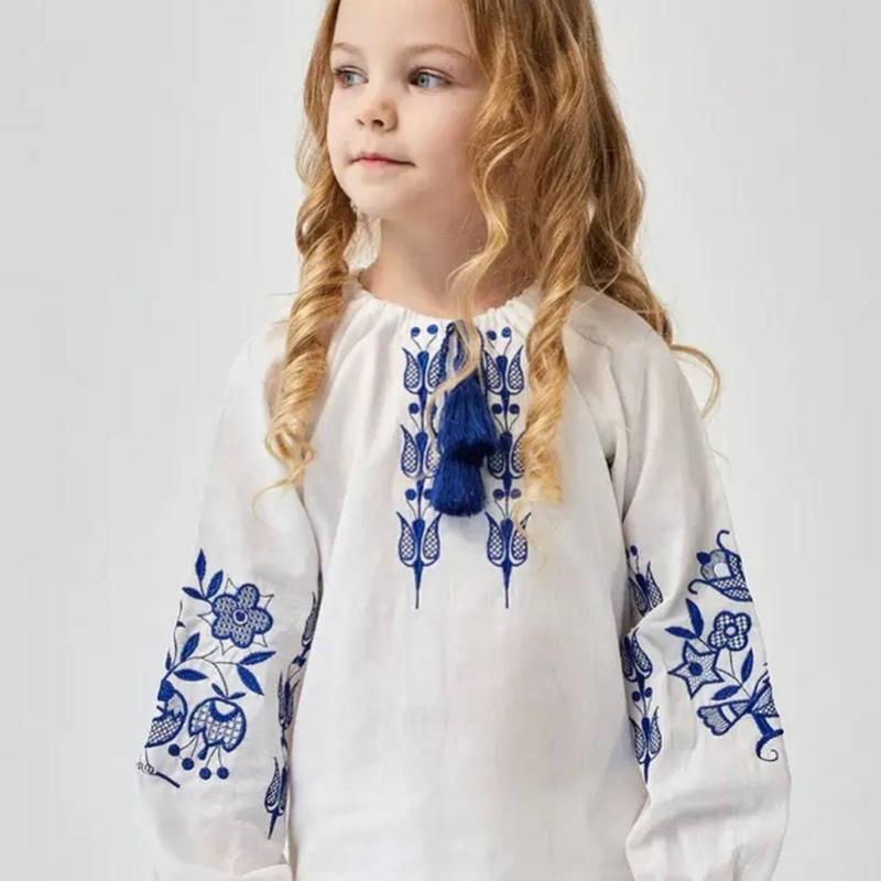 Красивая вышиванка для девочки на длинный рукав "Птица в цветах". Перед блузками и рукавами украшены вышивкой гладью, синего цвета. Горловину можно регулировать с помощью шнурочка с кистями. Вышиванка должна быть свободной. Маломерит на 1-2 размера.