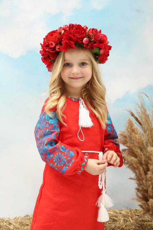 Размерный ряд: с 86 по 164 Платье, прямого кроя, по низу украшено кружевом. Вышивка машинная Материал: домотканное полотно