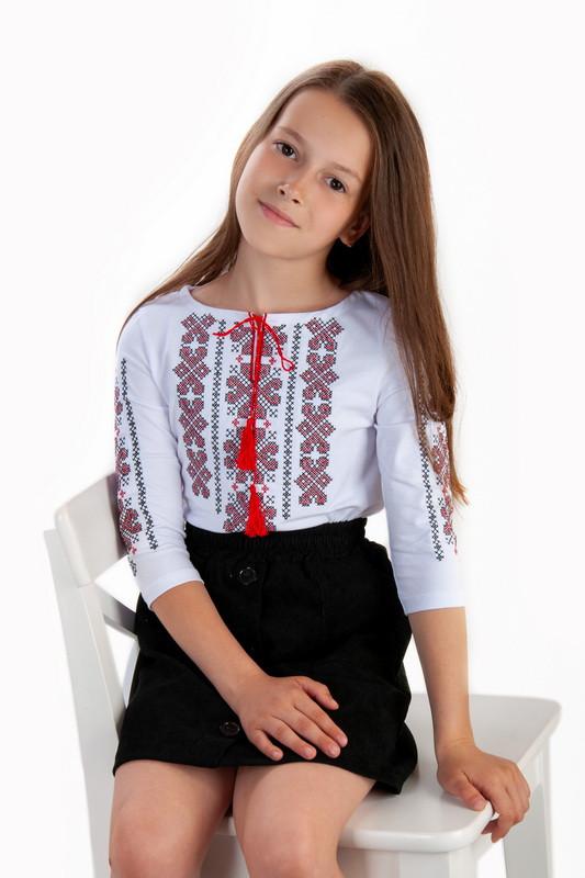 Вышиванка для девочек изготовлена из полотна "Стрейч-кулир пинье". Модель с округлой горловиной, длина рукава 3/4, спереди и на рукавах украшена невероятными узорами, которые вышиты на вышивательной машинке. Такая вещь является актуальной независимо от сезона, статьи или возраста, она отлично комбинируется с брюками или юбками. Вышиванка - неотъемлемый аксессуар каждого украинца. Полотно: стрейч-кулир пенье Склад: 95% бавовна, 5% еластан Рекомендации по уходу: стирать при температуре не более 30°C, вышивку гладить только по изнаночной стороне.