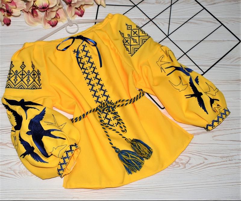 Вышиванка на девочку "Желтые Ласточки" Описание ✅Арт: 75245 ✅Выр-во: Украина ✅Тка-на: габардин ✅Дополнительно: вышивка машина, пояс в подарок ( может быть цветной), рукав Бохо Кисточка на горловине может быть, белая, голубая или желтевая. ✅Замеры: длина/ширина/рукав от горловины 158--67/44/59 ✅Возможна погрешность в измерениях +- 1/2 см