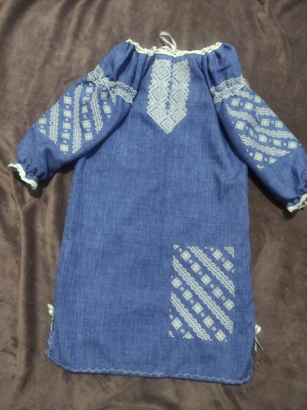 Вышитое платье для девочки, ткань льногабардин синего цвета, замеры на фото, размер 134-140