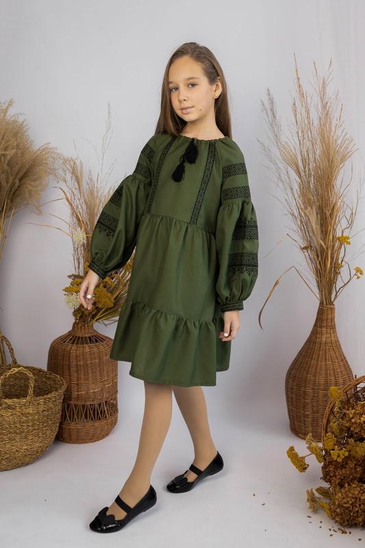 Размерный ряд: 86-164 Платье вышиванка для девочки свободного кроя. Выполнена в стиле милитари. Материал: домотканное полотно Вышивка: техника машина