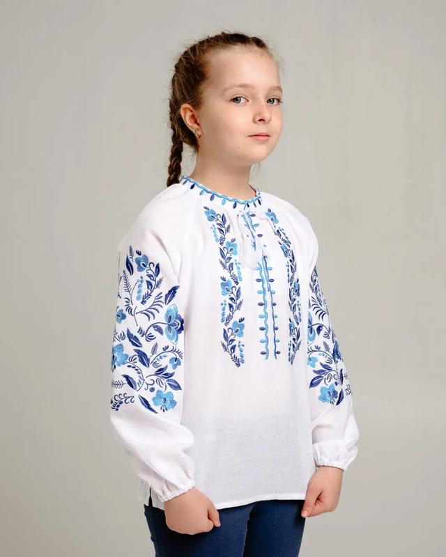 Детская вышитая рубашка белого цвета. Цветочный узор в голубых тонах украшает рукава, перед вышиванки и спинку. Горловина на завязках, с белыми кистями. Размеры 140-158 +150 грн