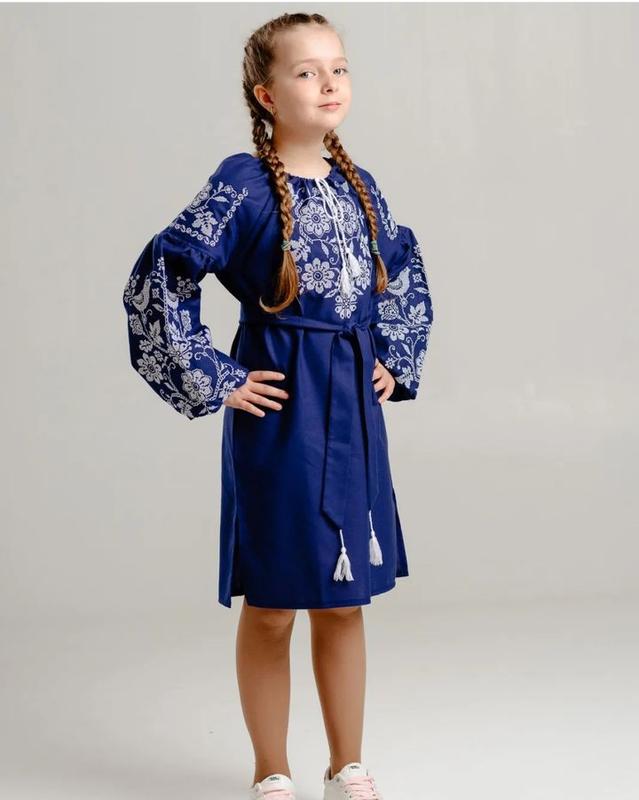116-158 размеры. Стоимость платья от 146 р +100 грн. Вышитое платье для девочки яркого синего цвета. Платье прямого кроя, комплектуется поясом в тон ткани-основы. Белый орнамент щедро украшает грудь и рукава. Такое платье станет отличным вариантом праздничного наряда. Цвет ткани и вышивки изделия может несколько отличаться от изображения на экране из-за неточности передачи цвета монитором