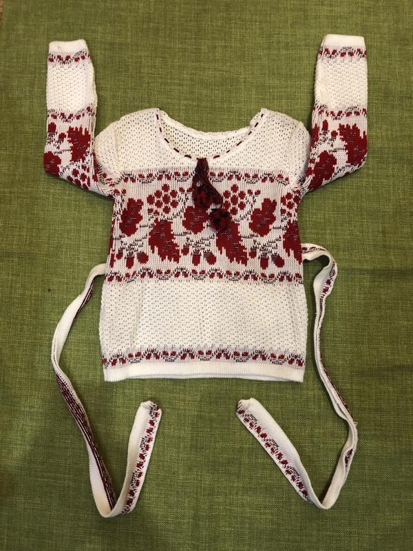 Вышиванка теплая на девочку Состояние: новый (без броков) Замеры: полуобхват по груди 29 см; длина 42 см; длина рукава 35 см; плече 6 см; Тканина: акрил Цвет: белый/красный