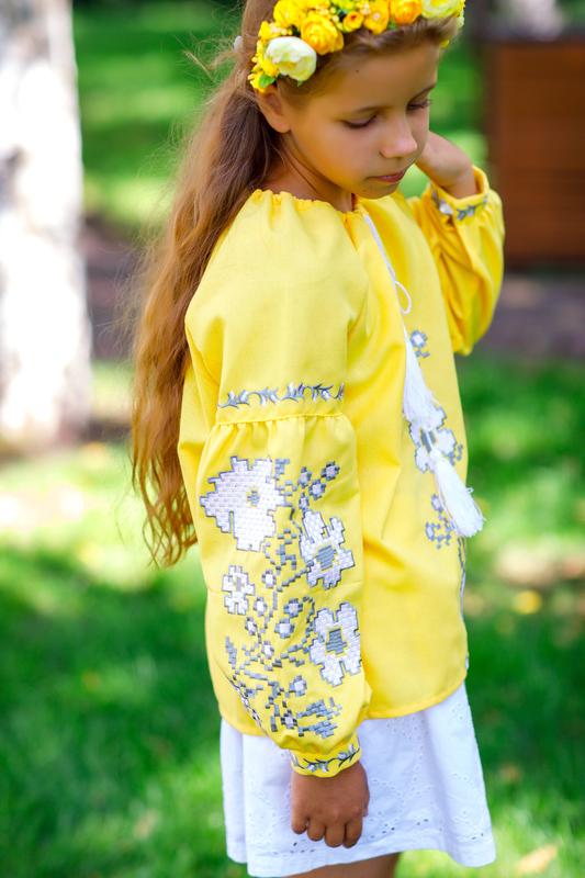 Размерный ряд: 86-164 Тканина- домоткане полотно жовтого кольору Вышивка – машинная, техника -корошка