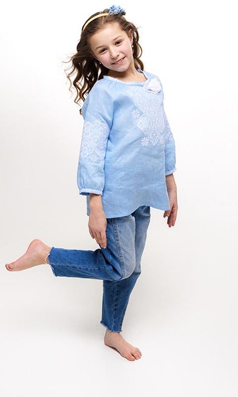 От 140 размера +200 грн. От 152 р + 300 грн Голубая льняная вышиванка для девочки с рукавом 3/4. Рубашка из натурального льна украшена орнаментом, вышитым крестиком белой нитью. Сочетание натуральной ткани, лаконичного кроя и вышивки отлично подойдет к любому низу.
