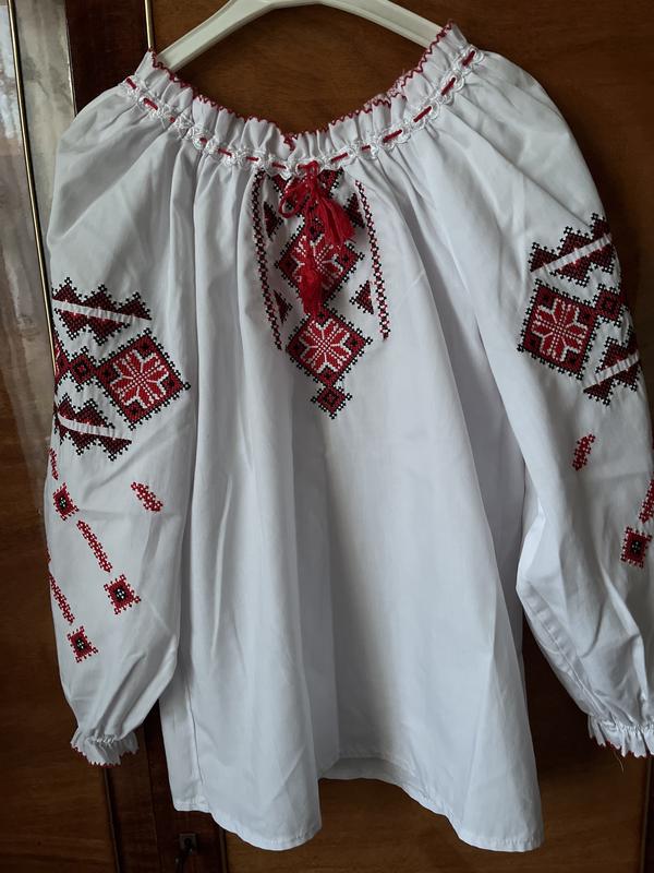 Вишиванка для дівчинки, червоно чорна вишивка з кутасиками. Рукава на гумці, горловина на завʼязку.