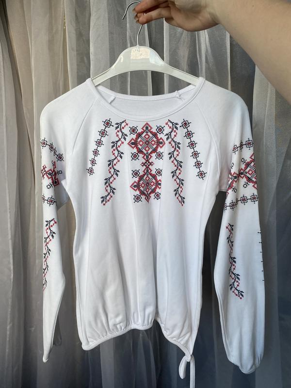Вышиванка для девочки. Размер 140. Цвет - белый. Замеры: Длина по спинке 44 см., Длина рукава от горловины 57 см., Полуобъем груди 36 см., Полуобъем низа вышиванки 35 см.