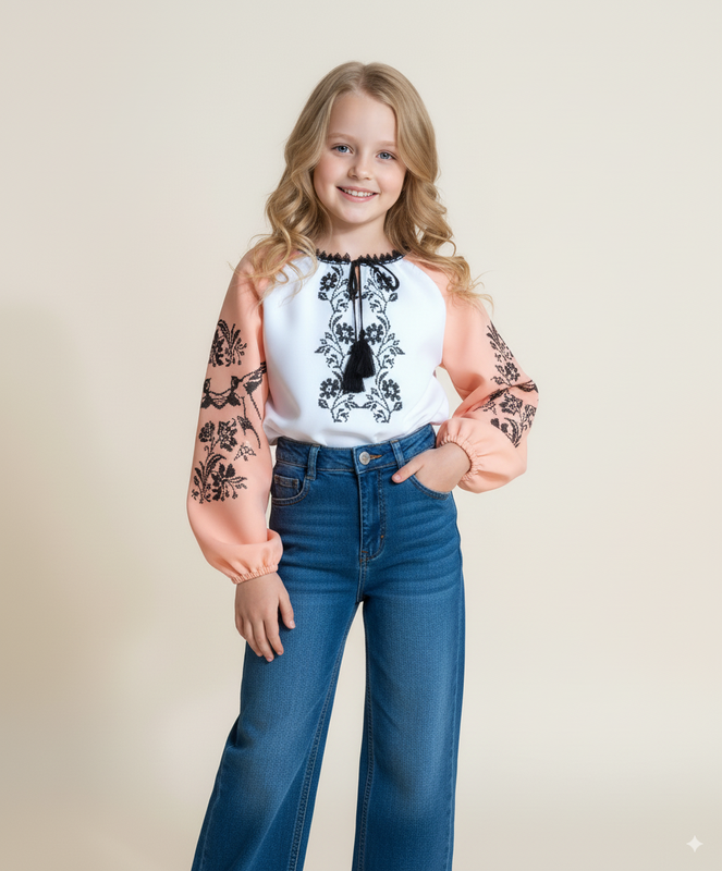Новинка, вишиванка на 7-8 років зріст 122-128 см, довжина 50 см, рукав четвертний. ПОГ 40 см. Колір білий+ ніжно-персиковий