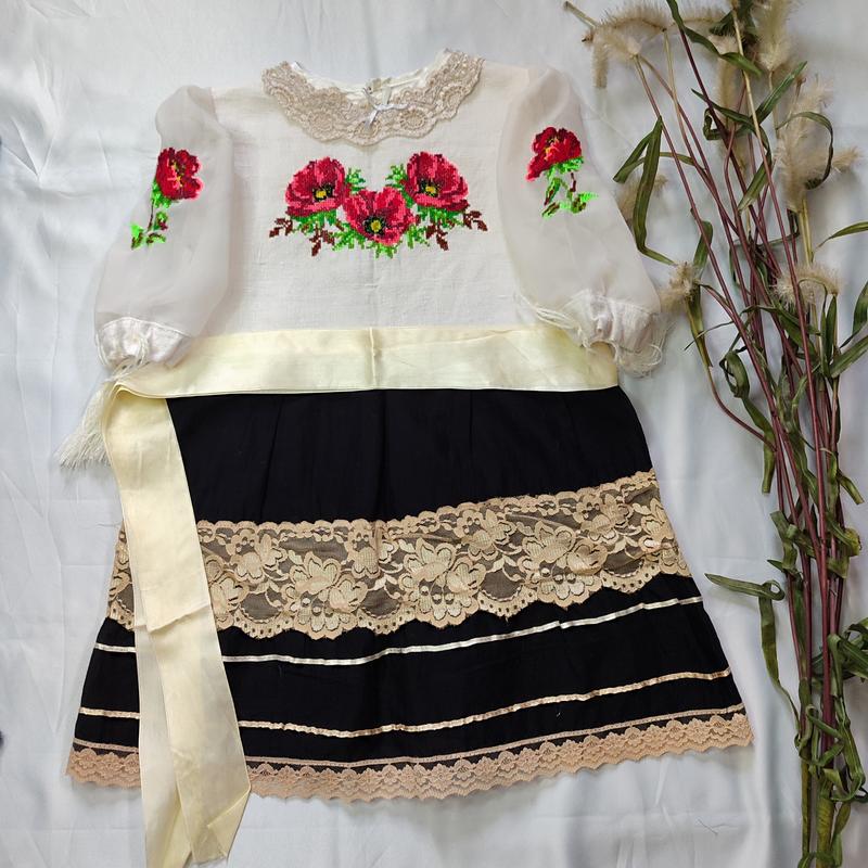 Вышитое платье детское ручная вышивка ◽Цена 330 грн ◽ Тканина: верх льон, низ сорочкова, рукав шифон ◽Цвет: верх бежевый, низ черный с бежевым кружевом ◽Размер: 104-110 (4-5 лет) ◽Замеры: ПОГ 31,5 Длина 55 Длина рукава 26,5
