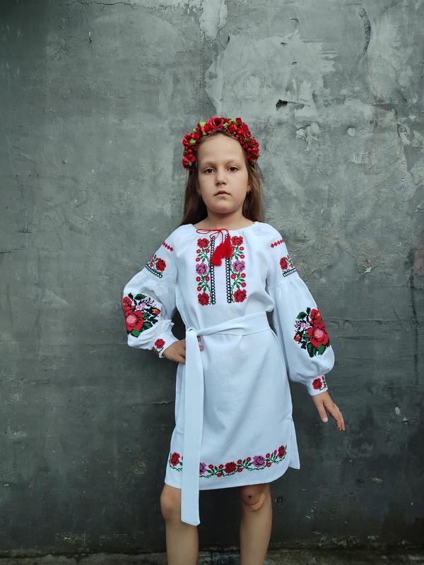 Стоимость указана за размеры 116-128 см. Стоимость 140-152 +100 грн. В наличии в небольшом количестве. Ткань лен с узором белого цвета. Платье без разрезов. Вишивка хрестиком. Заміри на фото. Платье полномерное. 116-152 см Рост девочки 133, на ней размер 128.