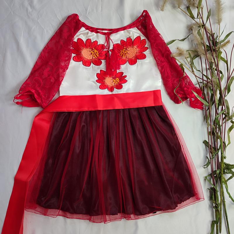 Вышитое платье детское ◽Цена 550 грн ◽ Тканина: атлас, фатин, мереживо ◽Цвет: молочный верх, черный низ, красная сетка ◽Размер: 98-104 (3-4 года) ◽Замеры: ПОГ 30 Длина 59,5 Длина рукава 30,5