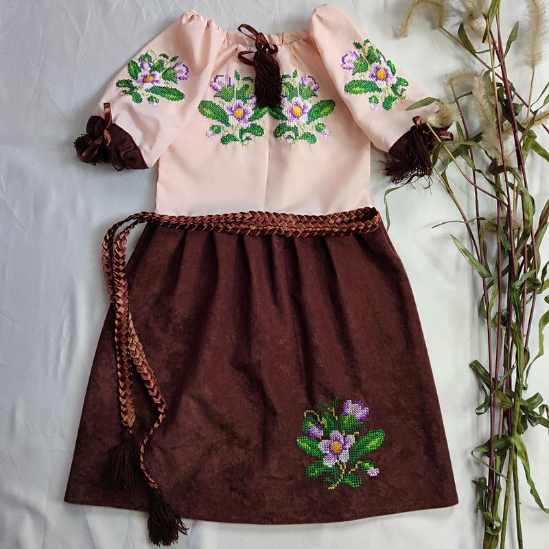Вышитое платье детское ◽Цена 580 грн ◽ Тканина: верх штучний шовк, них велюр ◽Цвет: персиковый верх, коричневый низ ◽Размер: 104-110 (4-5 лет) ◽Замеры: ПОГ 26,5 Длина 66 Длина рукава 22
