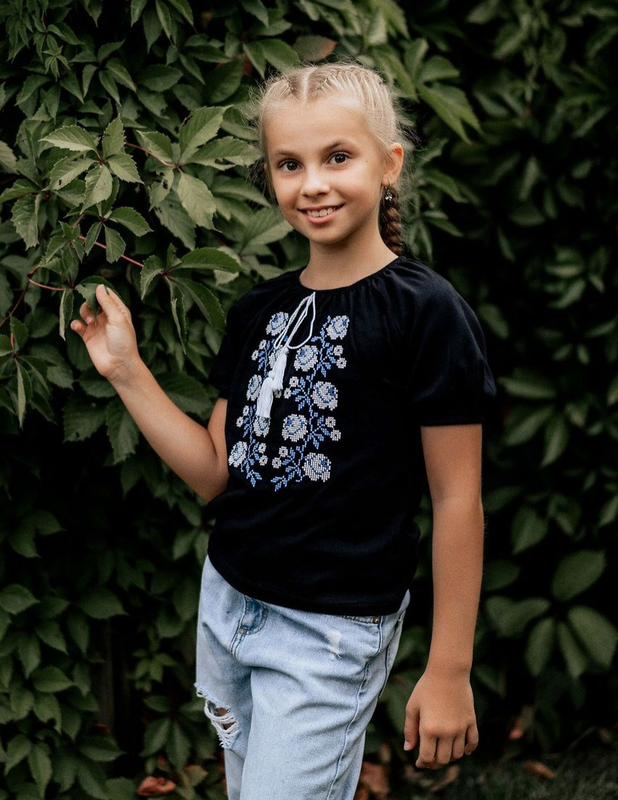 Черная вышиванка для девочки подростковая с голубой вышивкой, вышитая рубашка трикотажная...
