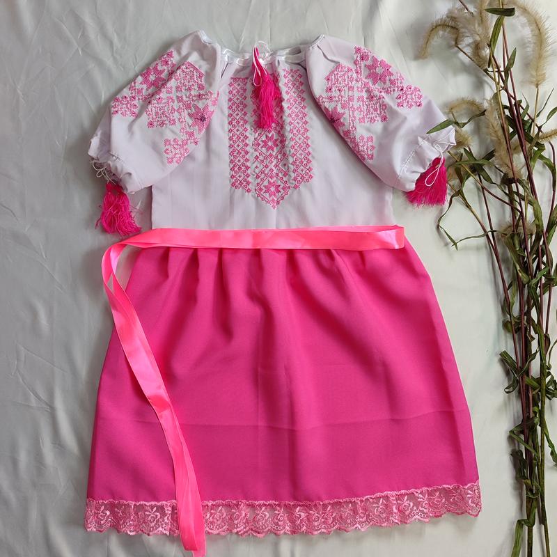 Вышитое платье детское ◽Цена 680 грн ◽ Тканина: сорочкова верх, габардин низ ◽Цвет: белый верх, розовый низ ◽Размер: 110-116 (5-6 лет) возможно будет и на 7 лет ориентируйтесь на замеры ◽Замеры: ПОГ 34 Длина 72 Длина рукава 24,5