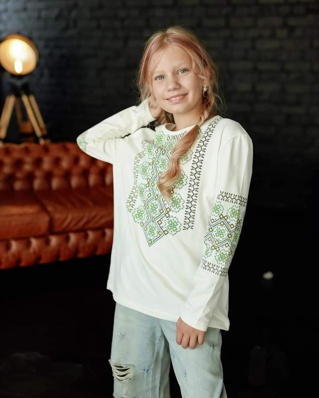 Зріст: 110-170 колір - білий. молочний Декор: Принт Полотно: фулікра однотонна Склад полотна: 95% бавовна, 5% лайкра Джемпер для дівчинки пошитий з еластичного трикотажного полотна - фулікра. Полотно гарної якості, при правильному догляді не дає усадку, не линяє та не скочується . Джемпер має округлу горловину. Рукава та перед прикрашені гарним патріотичним принтом у вигляді вишивки. Джемпер чудово підійде для святкових заходів або для повсякденного носіння, можна поєднувати з джинсами або брюками.