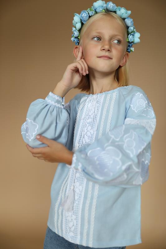 Розмірний ряд: 86-164 Сорочка вишиванка для дівчинки виконана на ніжно пастельному блакитному полотні. Оздоблена вишивкою та мереживом. Матеріал: домоткане полотно Вишивка: машина