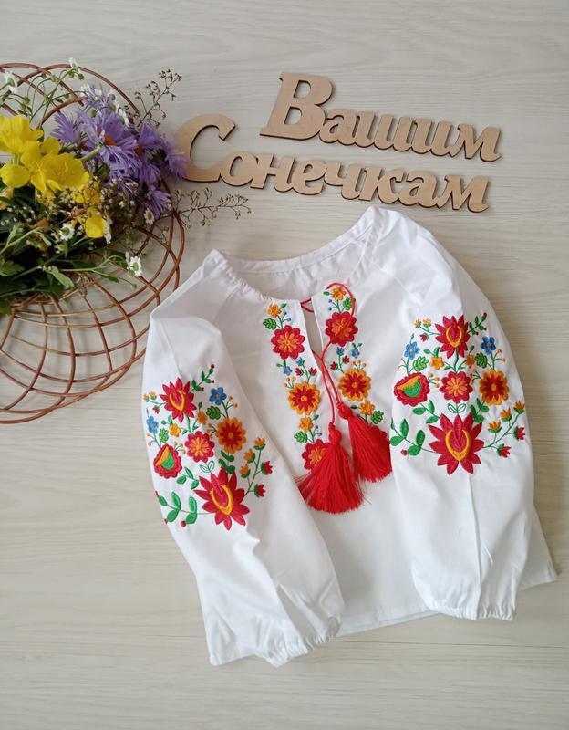 Красивая вышиванка "Цветчатая" цветная вышивка на рукавах и спереди горловина стягивается кисточками тканина -бязь, склад -100%бавовна очень нежная и стильная модель р 116 р122 р128 р134 выбирать по замерам!!!маломерит!!! замеры: ширина в груди/длина рукава от горловины/длина изделия,см 116:: 36см/44см/39см 122: 37см/45см/42см 128: 38.5см/49см/42см 134: 40см/50см/45см допустимо+-2см