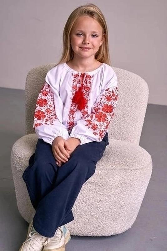 ЧАРІВНА вишиванка виконана у червоних кольорах на білому полотні вишивка на рукавах і по грудях зверху стягується червоними китичками Тканина: бязь (100% хлопок) вишивка : машинна гладдю 128 см 1шт 134см 2шт 140см 2шт 146см 2шт 152см 1шт заміри: довжина/ширина у грудях(пог)/рукав від горловини 128:: 42/38.5/48см 134: 44.5/40.5/50см 140: 48/43/53см 146: 49/44/54см 152: 51.5/45/56.5см