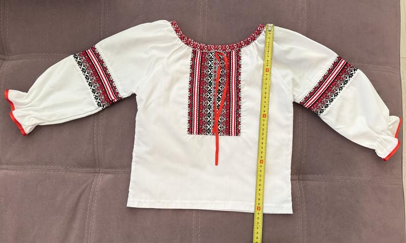 Вишиванка на 6-7 років Обʼєм горловини фіксується затяжною смужкою. Рукав може спершу бути в усю довжину, в з віком як 3/4, виглядає досить добре.