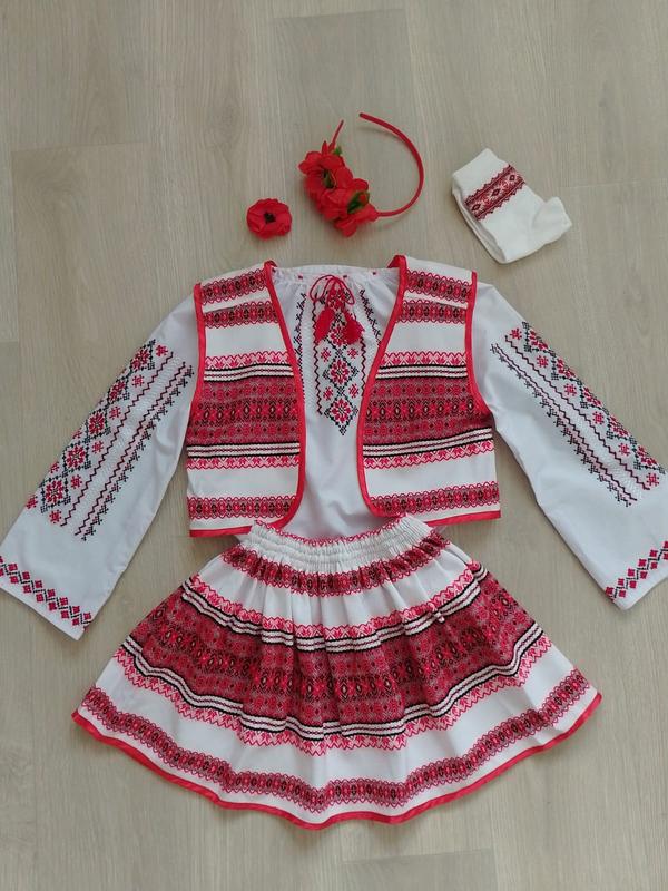 Продається набором: вишиванка, спідничка, безрукавка, обруч, заколка, шкарпетки. Є ще одна безрукавка, приблизно на 2-3 роки. Вишита сорочка: довж.48см, під рукавами 38,5см, рукав 48,5см. Безрукавка більша: довжина 32см., ширина 35.5см. Менша безрукавка 26,5см довжина, ширина 28см Спідниця: талія 20см. на резинці, тягнеться до 33см, довжина 31см