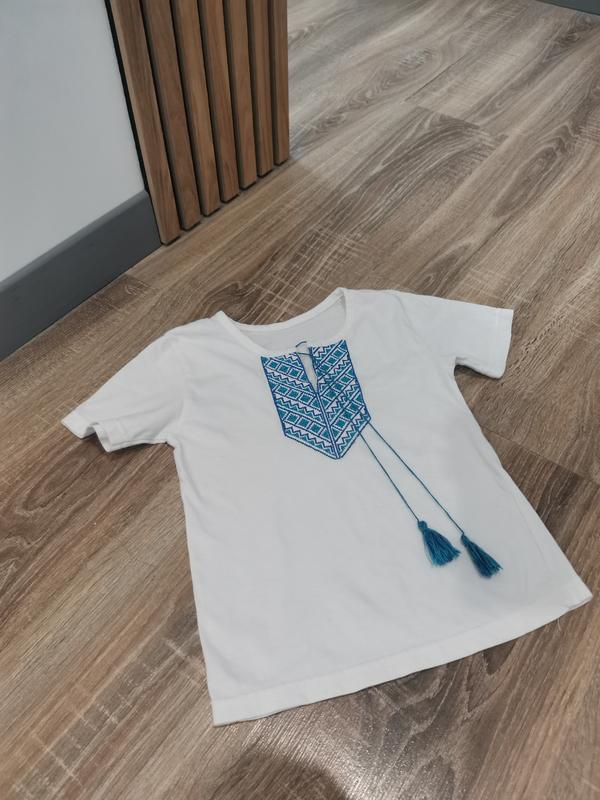 Вышитая футболка, примерно на 104 размер. Длина 42 см. От подмышки до подмышки 32 см.