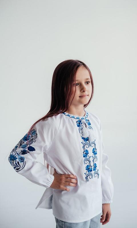 Блуза для девочки с вышитым орнаментом гладью. Цветочный узор в голубо-синих цветах украшает перед рубашки и рукава. Горловину отделывают белые кутасики. От 140 + 100 грн