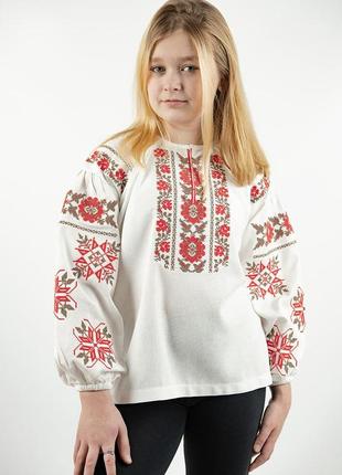 тканина- льон рост 110-140 рост 146-164 + 150 грн❗ Эта вышиванка для девочки сочетает в себе элегантность и украинскую культуру. Оригинальный узор символизирует красоту, молодость и связь с природой. Такой наряд подойдет как для особого случая, так и для повседневного использования. Достоинства модели: Удобство. Свободный крой не сковывает движений, что особенно ценят активные дети.Дышащий материал. Лен мягко прилегает к телу, дарит комфорт и подходит для любого времени года.Мицная вышивка. Узор выдерживает многократную стирку и остается как новый.