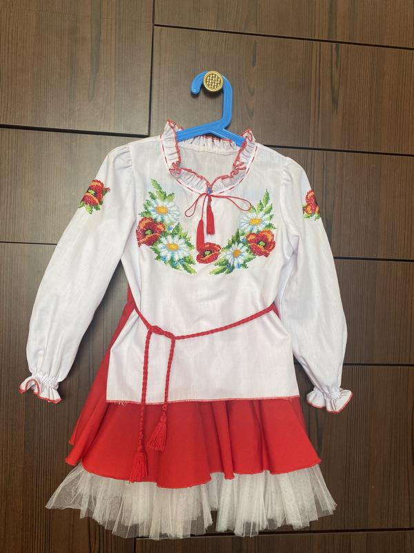 Дитяча вишиванка вишита бісером. Підходить на 5-7 років. Єдиним недоліком є те, що резинку на спідниці трішки зачепили, видно на фото.