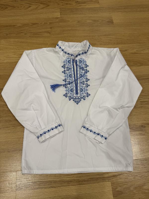 Вышиванка для мальчика в идеальном состоянии. Один недостаток, нет одной завязки. На рукавчиках застежка кнопка, воротник стойка. Замеры: длина рубашки-55 см, ширина под руками-40 см, длина рукава-46 см.