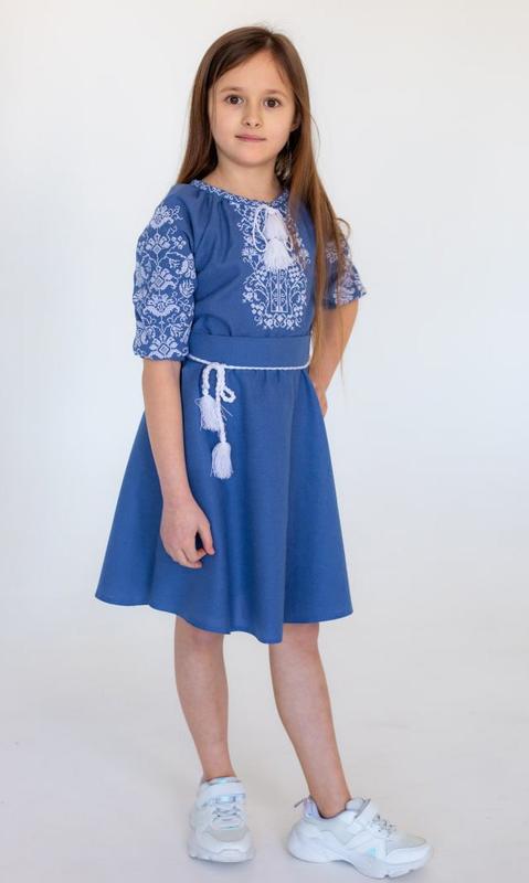 Вышитое платье для девочки синего цвета под джинс. От 140 р +150 грн От 152 р +250 грн Модель свободного кроя с округлой горловиной с завязками-каташками, рукавами реглан 3/4, съемным пояском из основной ткани. Белый орнамент щедро украшает грудь и рукава. Такое платье станет отличным вариантом праздничного и повседневного наряда.