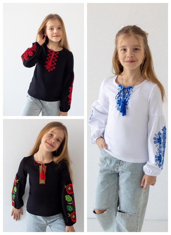 Блуза с длинными пышным рукавом с вышивкой черная белая,вышиванка для девочки с длинными п...