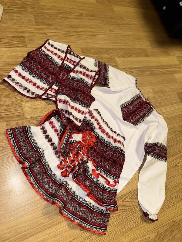 Дитяча вишиванка трійка Дуже практична , сорочку можна одягати під іншу спідничку , брюки, джинси, жилеточку можна комбінувати з білою сорочкою або футболкою, можна костюмом , теж саме я з спідничкою можна комбінувати . Натуральна тканина Одягнута була пару разів так як маємо багато інших Привезли з Закарпаття на подарунок