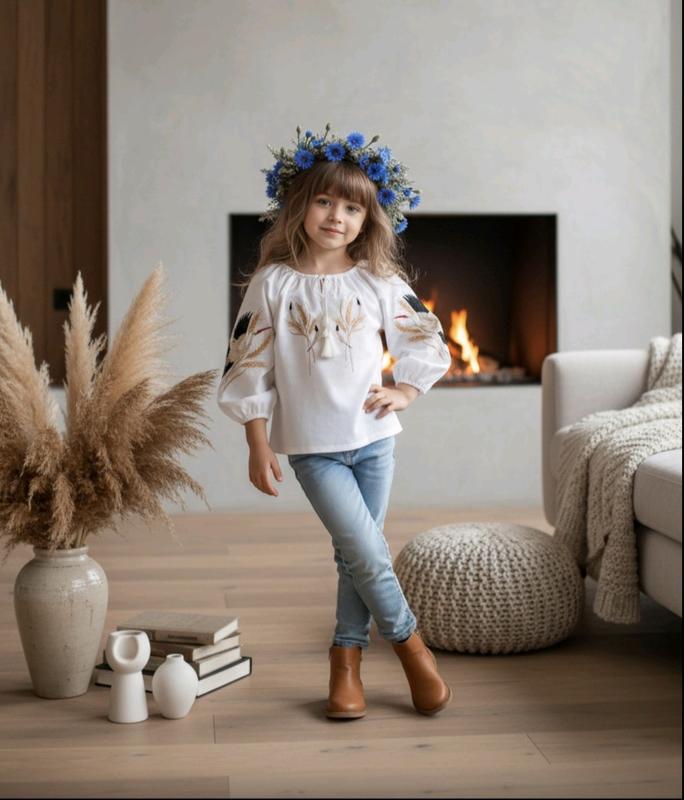 Вышиванка для девушек льняная с аистами. Очень красивая вышиванка для девушек. Ткань 104-122 паплин, 128-146 лен. Вышивка машинная, но очень красивая. Производство Украина. Ребен**********, 146. Цена 890 грн