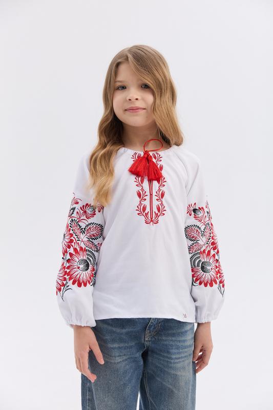 Вышитая блуза для девочки Георгина выполнена из белого домоточного полотна, что придает ей особую натуральную красоту. Прямой свободный крой обеспечивает удобство и свободу движений, а широкий рукав на резинке добавляет нежный акцент. Серо-черная вышивка придает изделию особый шарм и глубину. Георгина является символом не только красоты и элегантности, но и силы, выносливости и внутреннего спокойствия. Ее присутствие в орнаменте придает особую глубину, передавая ощущение нежности и эмоционального достоинства.