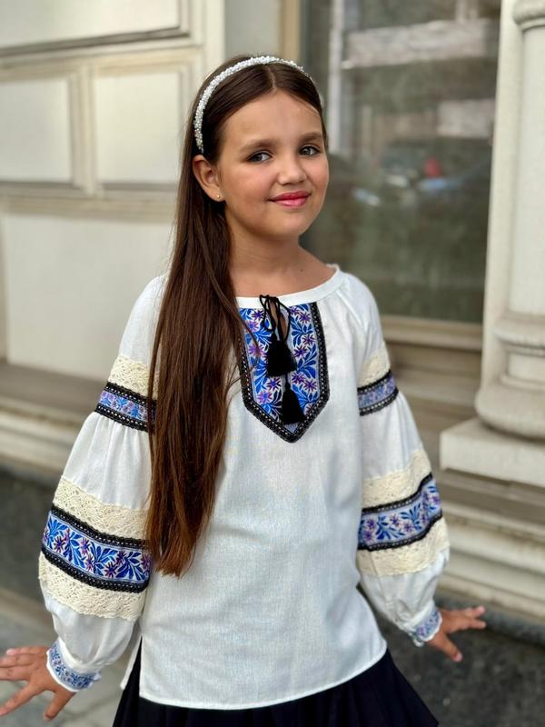 Натуральная, дышащая ткань: лен. Блуза украшена жаккардовой стрейкой и х/б кружевом ВЫМЕРЫ: р.128 длина/ширина/рукав от горла 51/36/50см р.134 длина/ширина/рукав от горла 52/38/51см р.140 длина/ширина/рукав от горла 55/39/53 см р.146 длина/ширина/рукав от горла 57/42/56см р.152 длина/ширина/рукав от горла 59/44/58см р.158 длина/ширина/рукав от горла 62/45/60см р.164 длина/ширина/рукав от горла 64/47/62см.